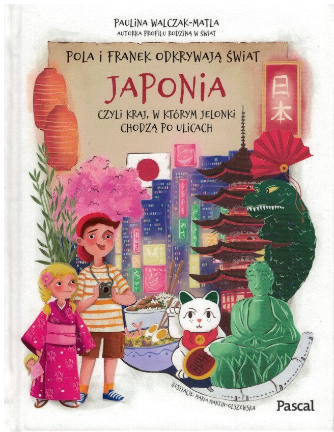 Cześć! To my: Pola i Franek. Razem z rodzicami zwiedzamy świat. Uwielbiamy poznawać nowe kraje i sposoby podróżowania. Polecimy samolotem do Japonii. W Tokio zobaczymy świątynię buddyjską i przywitamy się z Godzillą. Przejedziemy się tokijskim metrem i bardzo szybkim shinkansenem. Przymierzymy kimono i spróbujemy jeść sushi pałeczkami. W Kioto zwiedzimy bambusowy las i dowiemy się, jakie rzeczy można zrobić z bambusa. Zajrzymy do Nary, gdzie znajduje się ogromny posąg Buddy, a jelonki kłaniają się ludziom. Spróbujemy też lokalnych przysmaków. I oczywiście nie zapomnimy kupić pamiątkowego magnesu! Książka dla małych podróżników i ich rodziców. Dzięki niej dzieci będą chętniej odkrywały nowe miejsca i każda rodzinna wyprawa stanie się łatwiejsza! [opis wydawcy].